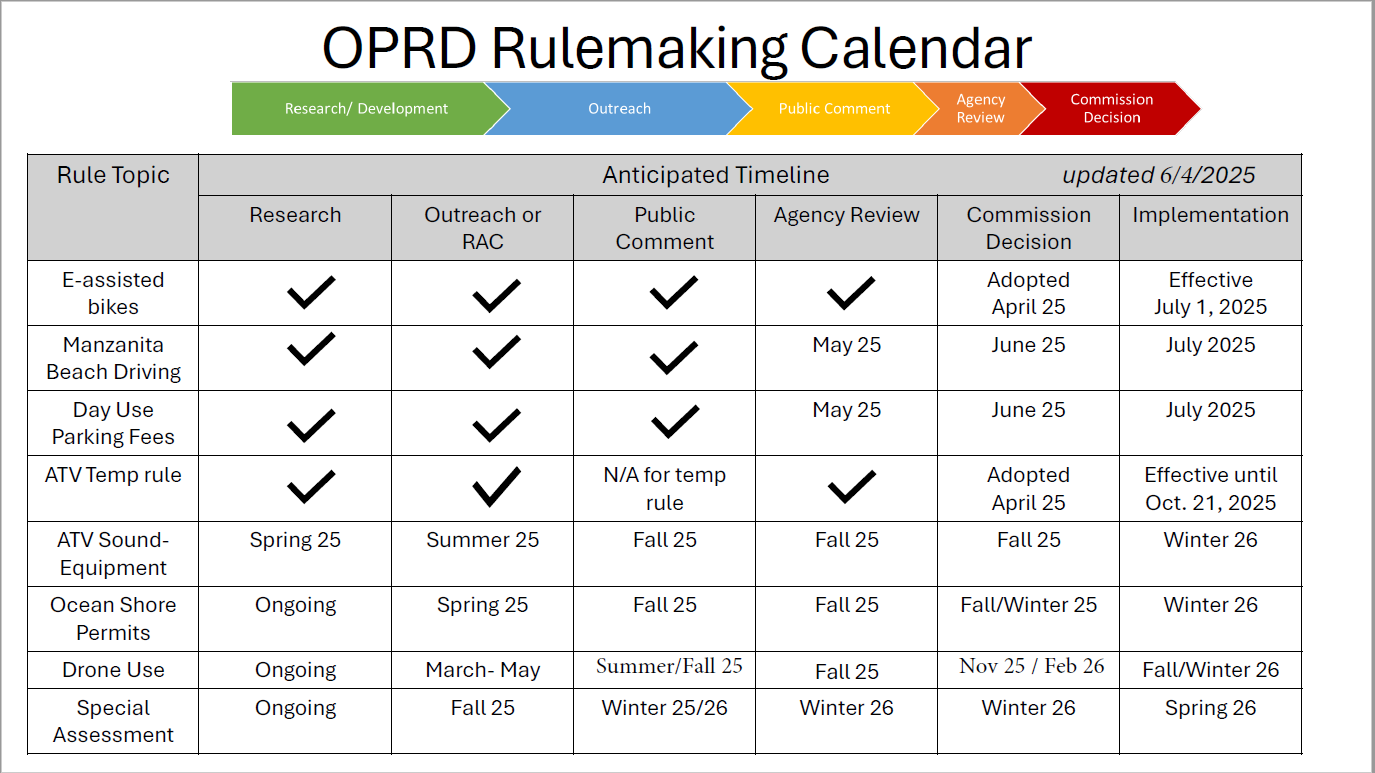 The Oregon Parks and Recreation Department (OPRD) is committed to transparency throughout the rulemaking process. OPRD does not currently have any proposed rules open for public comment. Information related to proposed, ongoing, or recently completed rulemaking efforts will be made available on this page. This includes summaries of proposed rules, fiscal impact statements, FAQ documents, minutes or recordings from rulemaking meetings, and public comments submitted during the rulemaking process. Please check this page for updates as new information becomes available.