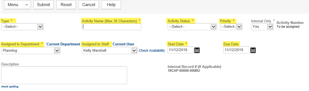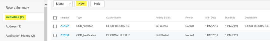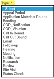 The Activity Types of Appeal Period, Application Materials Routed, Hearing, and Notification were developed for Planning and include additional fields to allow you to record specific details on these such as Appeal Deadline, Hearing Type, Hearing Date, Notification Date and Type. Bonding was developed for Public Works to record important bond details such as Bond Number, Date Bond Released, Bond Expiration. COD_Notification and COD_Violation were developed specifically for Code Enforcement inside the Planning Module and are integral to successfully managing Code cases in the system. The other Activity Types are generic in nature and can be used as appropriate, in any module, to track inbound/outbound phone calls, important emails sent/received, status checks done, meetings held, etc. Any of the Activity Types are able to be used in any module should you determine a good fit or business case.