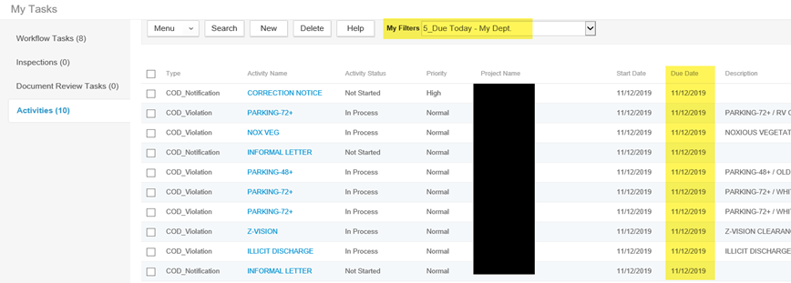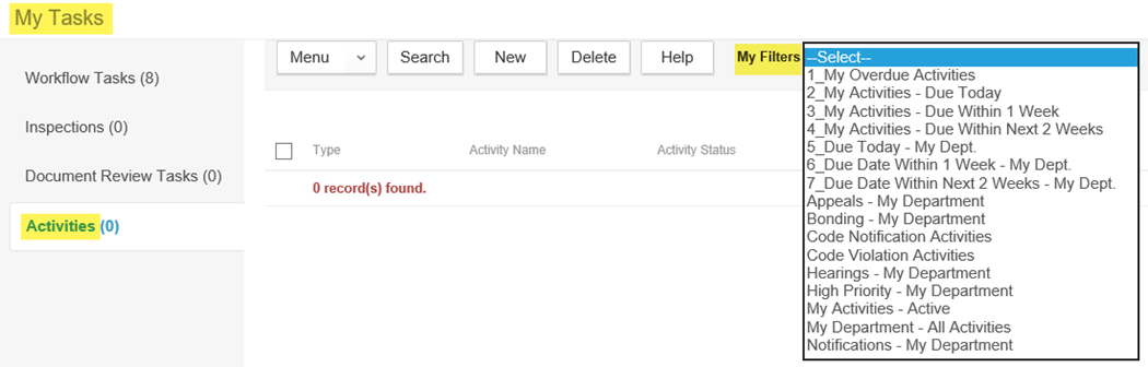 Activities can be seen on the My Tasks page > Activities tab – note there are several My Filters available to filter the activity list. Important, the Activities you see are those for the module you have set as your Preferred Module [see the Preference Management page to change this on the fly, as needed].