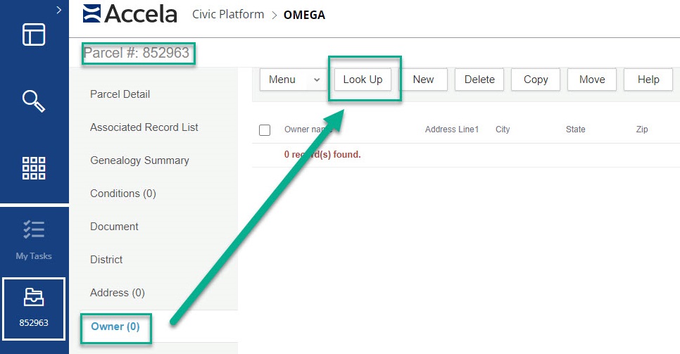 In the Parcels page, click on the owners tab to look up the owner information (this is important to do first so you don't duplicate the owner).
