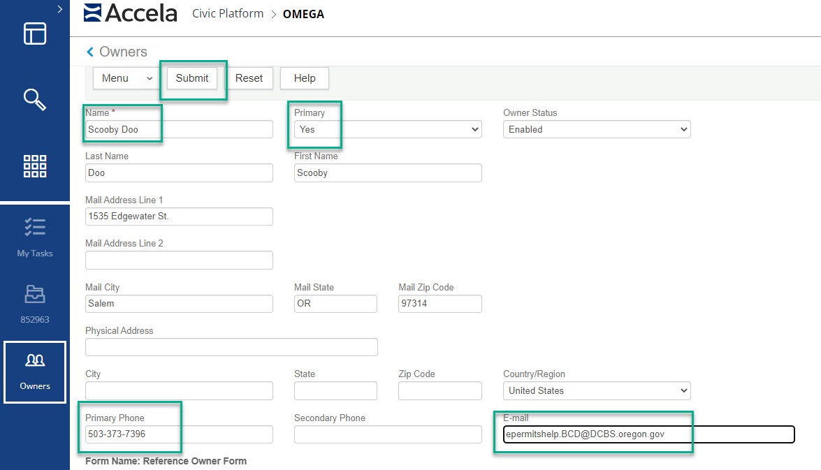 If the owner you are looking for is not showing in the search go to the Launchpad (nine squares) and select 'Owners' - this will allow you to create a reference owner. The page will have you search for part of the owner's name again and after the search the 'New' button is available, click on new then fill in the owner information making sure to fill in the name, phone number and email address at minimum along with making sure 'Primary' is set to 'Yes'. Submit when completed.