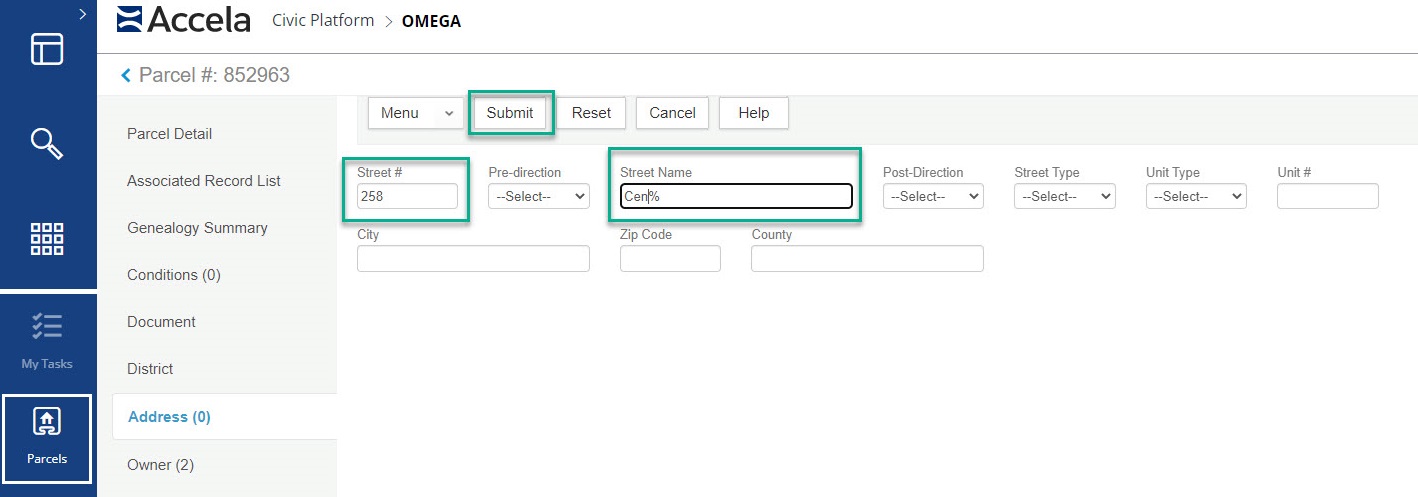 Lastly, in the address page go to the parcel tab and look up the parcel you created and select the submit button to search for it.