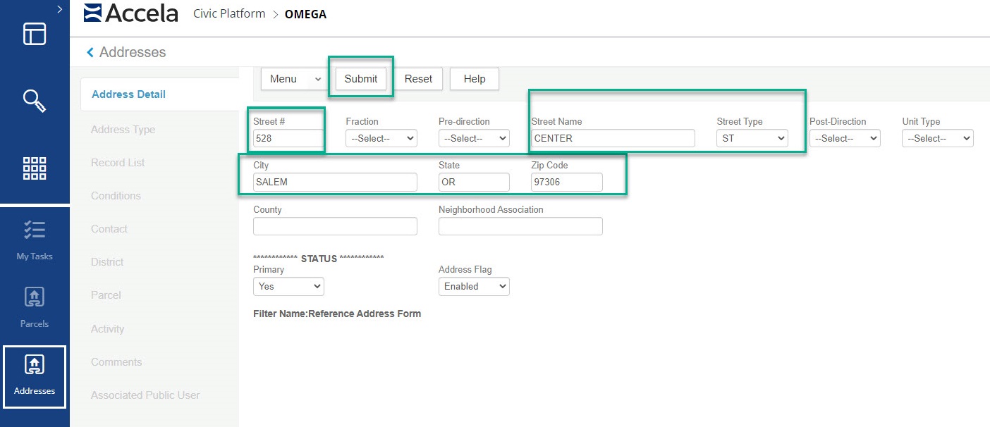 Addresses are made up of three parts, a parcel, an owner and an address. When you create and address you need to create each part to make the full address or your permit will be missing information. The information below shows how to make all of the addressing parts as a reference address which makes it available to be reused.