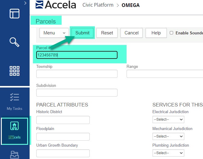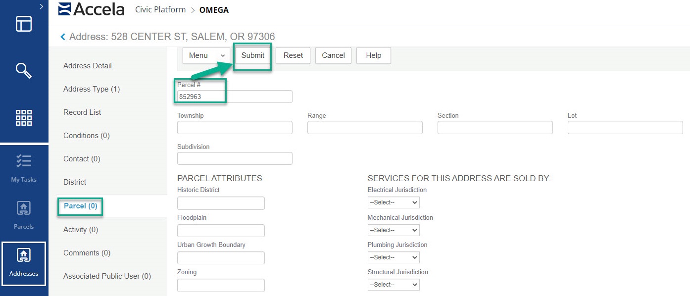 In the Parcels page, enter the parcel number then the submit button to search for the parcel to see if it is in the system. Note: You will not be able to see the ‘New’ button until after you have performed a search as this prevents duplicate information from being entered and all addresses must be tied to a parcel.