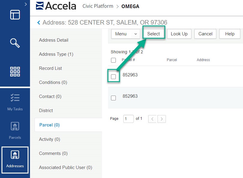 Lastly, connect the address to the parcel to complete the process. In the parcel page go to Addresses tab and search for part of the address to see if the address is already in the system. (be sure to use the % wildcard to search.) If you do find it in the search then check the box next to the address and click on select to add it. If it does not come up go to the Launchpad and select the addresses page.