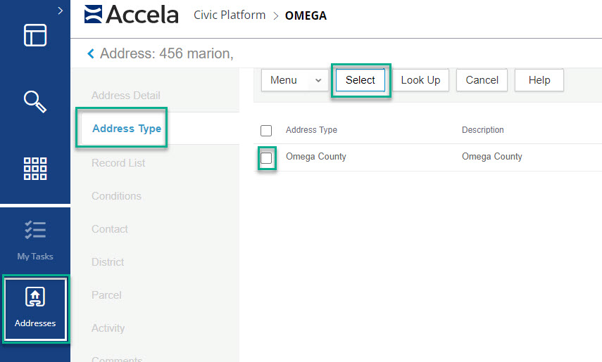 To add the address type, click on the Look up button, then submit to see your agency then check the box next to your agency and click on select to add the address type.
