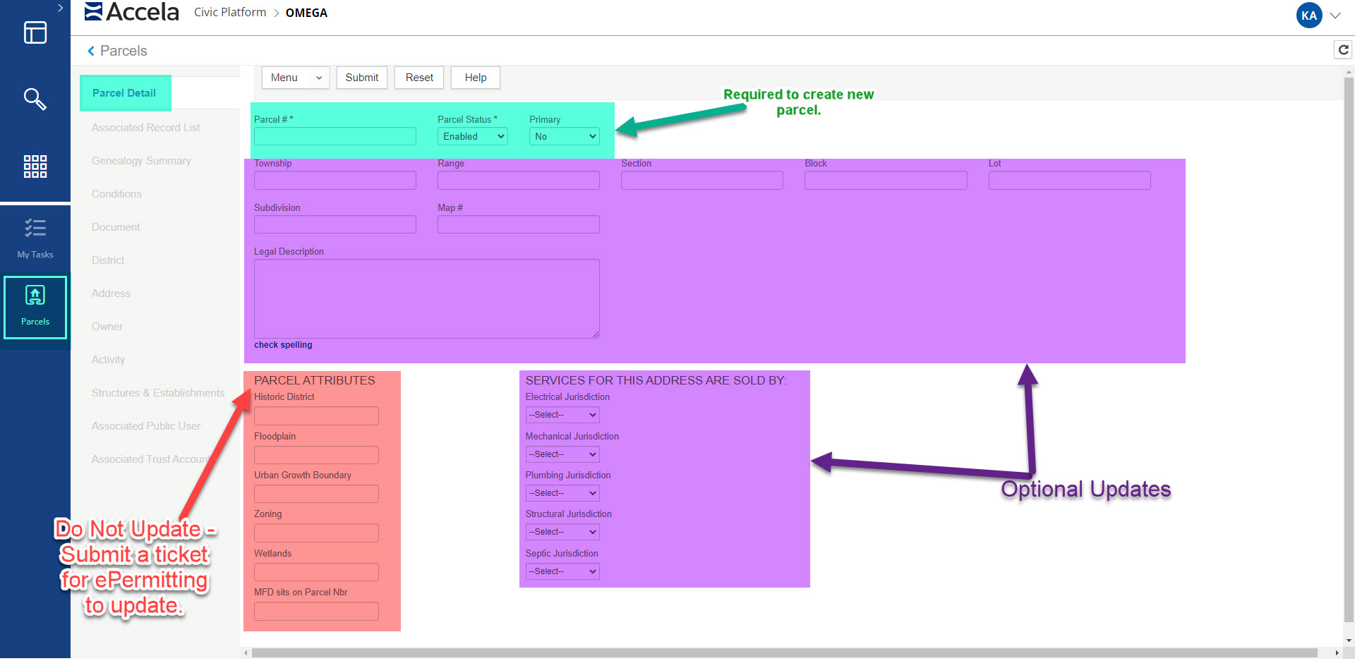 Continue creating the parcel by adding the parcel information into the fields. You are required to have the parcel number and to verify if the parcel status is enabled, change the primary selection to yes. If you know the township, range, section, block, lot, subdivision, map # or if there is a legal description needed add them. If you are a county you can also update the 'Services For This Address Are Sold By' section for what services are provided by the county or city. Note: Parcel Attributes are loaded by a script and need a specific designation DO NOT update these. If you need them updated please submit a Ticket with ePermitting with the parcel number and Parcel Attribute needed. Once you have the information entered submit to create the parcel.