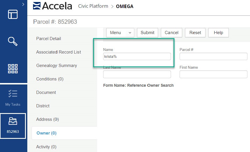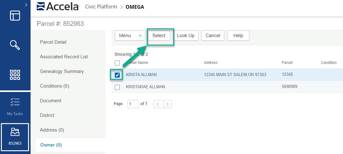 Now that the reference owner is created go back to the owner page in the parcel page and lookup the owner then to a partial search for their name. Once found check the box next to their name and submit. You now have your owner and parcel connected.