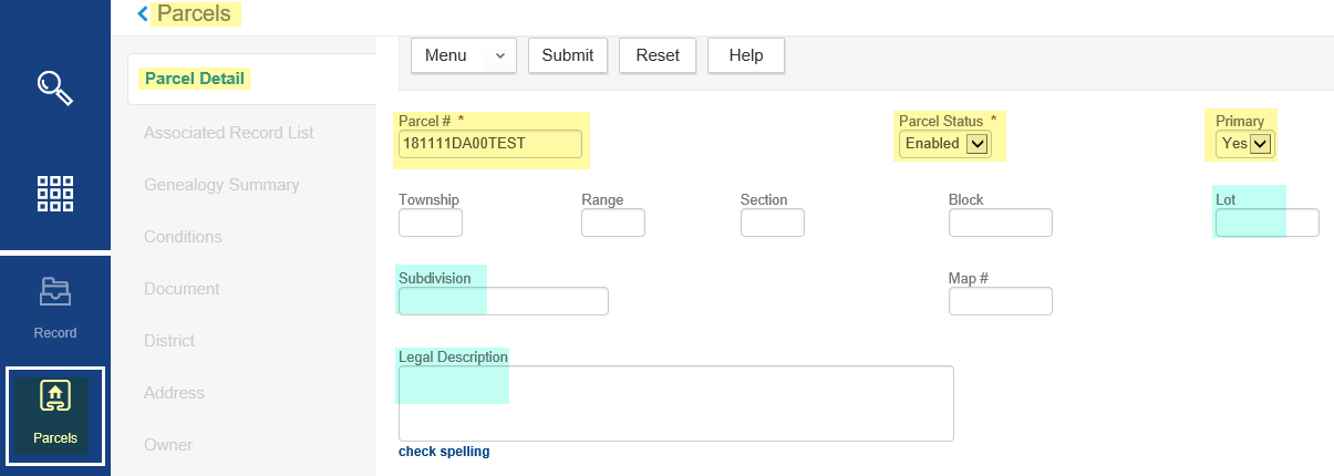 0 matches will be found if the parcel does not already exist in the Property reference data – 0 record(s) found. Next, select NEW to create a new parcel through the Parcels page – this is the best practice method for creating new APO records in your reference data. Enter the Parcel # to the Parcel Detail Tab, confirm the Parcel Status = Enabled and that Primary = Yes, and you can optionally input a Lot number, a Subdivision, or Legal Description if helpful or needed – as well as filling in any local custom parcel attributes that your agency might require. Submit to save the new parcel.