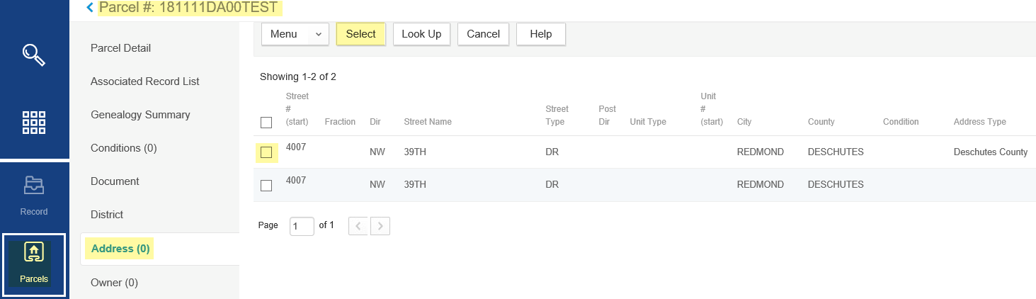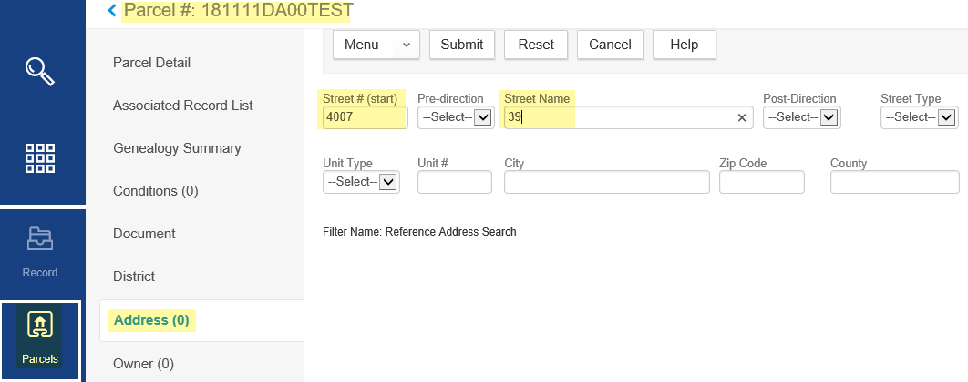 Once saved, select the Address tab in the Parcel page tabbed window. Once on the Address tab, select Look Up to first search for the address (enter Street # and Street Name only) that should be associated to the parcel number you have just added – Submit to search.