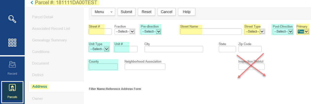 Creating a NEW address on a parcel, making sure to set Primary = Yes. Also, making sure to fill in any other locally required address details, such as County – do not fill in Inspection District on the Address, inspection districts are managed on the Parcel.