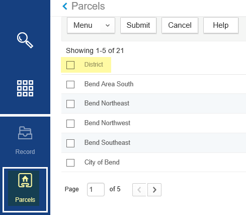 Important Note on Inspection District: If your jurisdiction uses inspections districts, make sure to select the District tab in the Parcel tabbed window to add the necessary Inspection District for this parcel. Simply select Search, and the pre-defined inspection district(s) should be listed there, check the checkbox for the inspection district appropriate to this parcel and Submit to save your selection. Inspection Districts affect inspection calendars, i.e.. which days and times are offered to the requestor - and/or - which inspector is auto-assigned (for those agencies electing to use auto-assign by district), i.e.. Joe performs inspections in Bend Area South district and Tim performs inspections in Bend Northwest district.