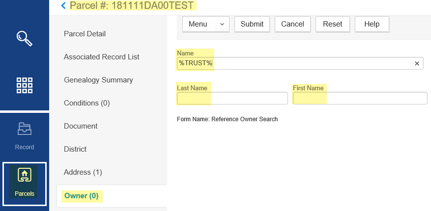 The Name field in the Owner Look Up is typically for business/organization names such the case with trusts, for instance – use the % symbol around your search word - i.e. %TRUST% - to do a partial search of all owner names containing the word “TRUST" in their name. The Last Name and First Name fields are typically for searching individual names of owner people. Important Note on successfully searching Owner reference data: the format of the information is highly dependent on how information was provided in your agency's APO data load that is provided to ePermitting, for example some agencies send over married couple names together in the Name field, such as “SMITH THOMAS & IRMA", while other agencies might use the first and last name fields, in this case where there are two individual names indicated. Make yourself familiar with how your agency indicates owner name information in the reference data that is provided for your agency.