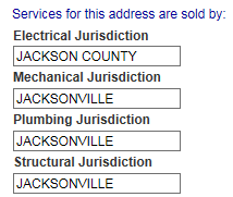In this example – Jackson County and the City of Jacksonville both offer Mechanical, Plumbing, and Structural services in general – but for this particular address, they both provide different services – Jackson County provides the Electrical while Jacksonville provides the other services. For customers applying on ACA, when they input this address – they need to see that Electrical Permits are made to Jackson County and other services are made to Jacksonville. ONLY COUNTIES need to designate service jurisdictions.