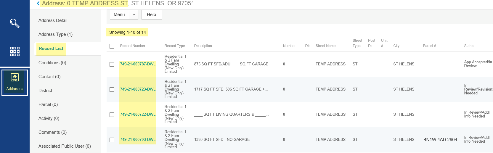 The temporary address also would NOT have an Address Type indicated unless you wanted it to be available for use thru ACA – but an online applicant would have to know the temporary address in order to search to it for application purposes – this is generally not recommended. Additionally, the temporary address would NOT have an Inspection District indicated since Inspection District is defined on the parcel and not on the address. The parcel used for application in this case would foreseeably be a valid existing parcel and owner.