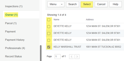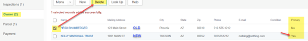 Owner tab. However, the system has automatically made the new owner the Primary which is key for inclusion on most reports such as the permit. By making the new owner the Primary = Yes, the old owner can now be successfully deleted – checkbox the old owner and select