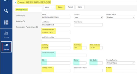 Launchpad > Owners reference page and search to the owner record you are needing to update. Click on the Owner name to open the owner record in reference. Make the necessary updates to Mailing Address, Physical Address, Primary Phone and/or Email, etc.