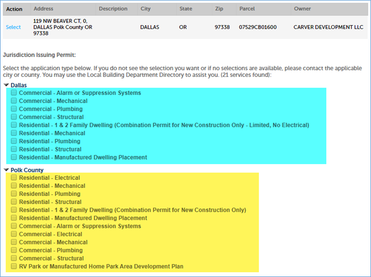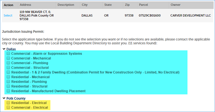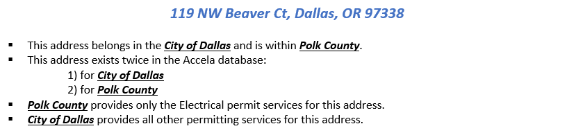 Public users - using the Public Portal see the following for this example address. City of Dallas provides all permitting services and Polk County provides only the electrical permitting service.