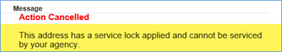 County staff will see the following message if they attempt to create a new record for a record type at an address that they do not permit for, based on the Service Lock Conditions. They will also be prevented from creating the record.