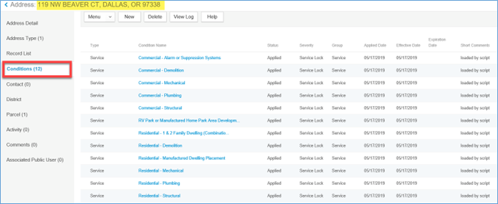 Service Lock Conditions are used in scenarios where the county provides only specific permit services for cities within their boundaries, like electrical, but they do not provide other services, like mechanical, plumbing, or structural. The Service Lock Conditions are applied to the address and “lock" or hide services that do not apply.