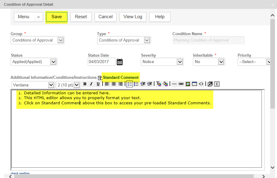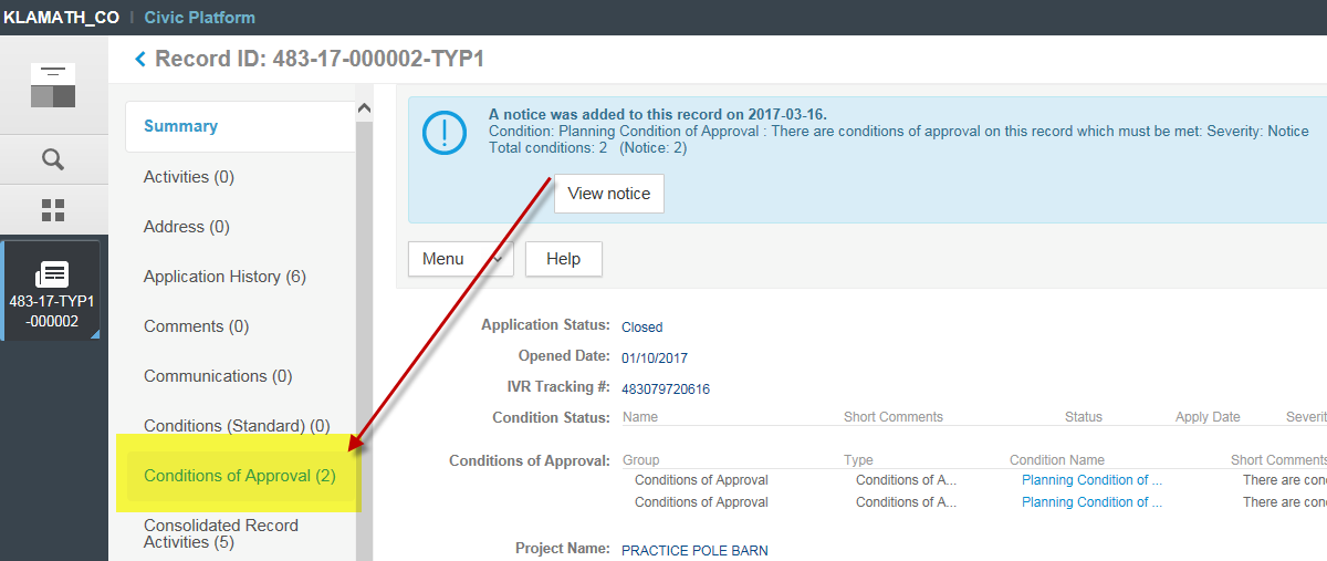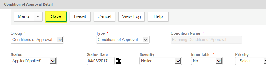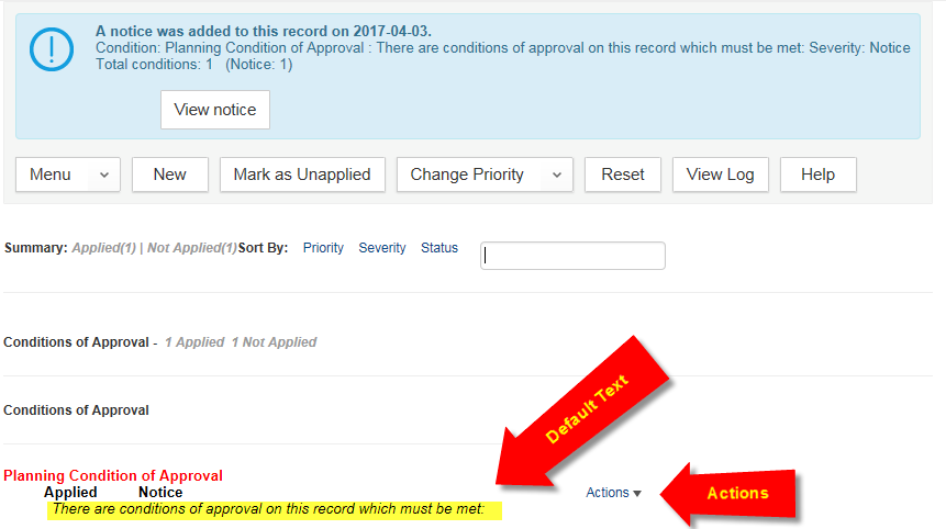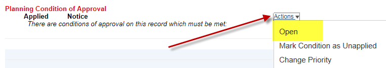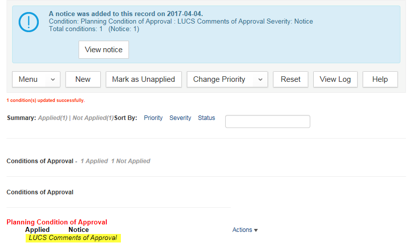 5. The Condition of Approval has now been added with a default comment: “There are conditions of approval on this record which must be met"