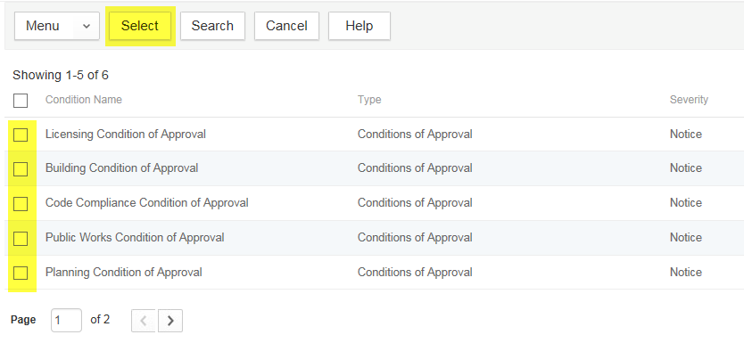 4. Check the box in front of the appropriate Condition of Approval, click the Select button.