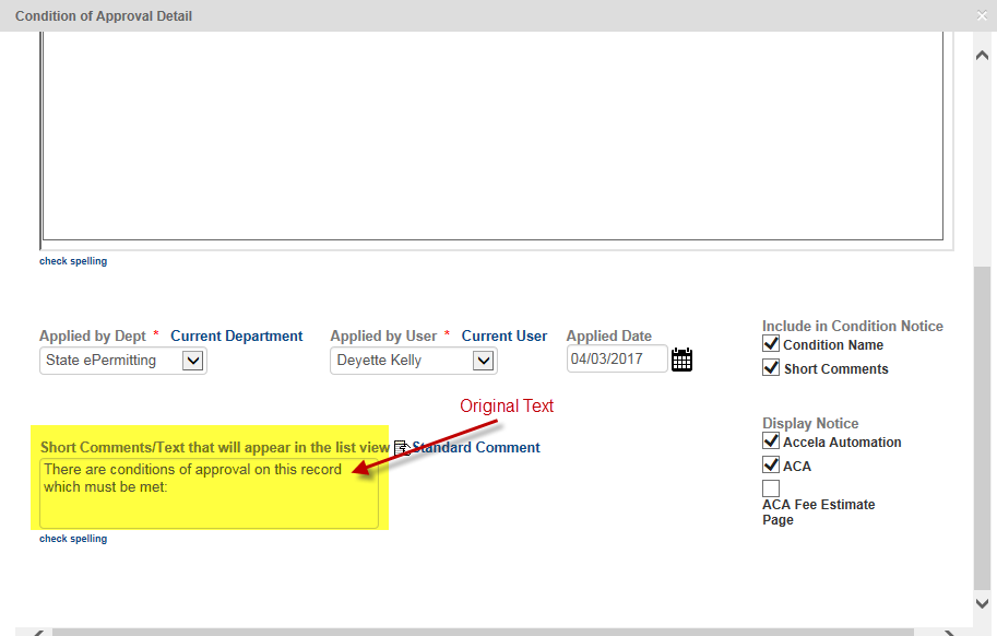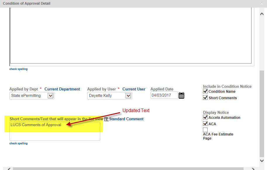 8. To update the default text that appears in the Conditions of Approval list for the record (see #5 above), scroll down and change the Short Comments (this step is optional).