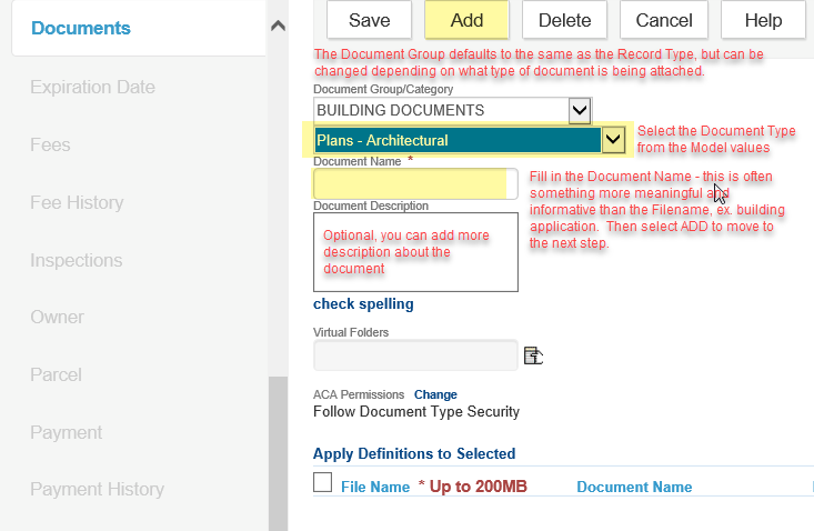 - Go to the Documents tab on the record > click NEW > select the appropriate 'Document Type' from the dropdown. IMPORTANT NOTE: any doc type that is 'Plans' will be restricted from view/download online, except by those people associated to the record, as plans are protected by copyright. Then fill in the 'Document Name' - this often is a more descriptive meaningful name than the filename, ex. building plans, then click ADD to actually attach the document: