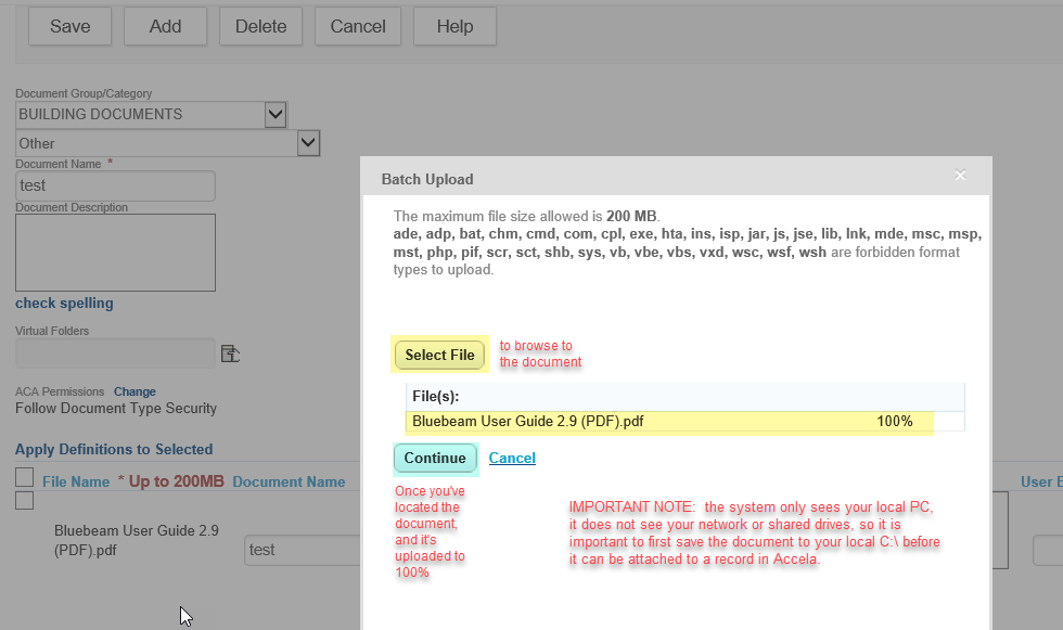 - Click the SELECT FILE button to browse to the file, locate the file. IMPORTANT NOTE: the system only sees your local PC, it does not see your network or shared drives, so it is important to first save the document to your local C:\ before it can be attached. Once the document uploads to 100%, click ADD to move to the next screen: