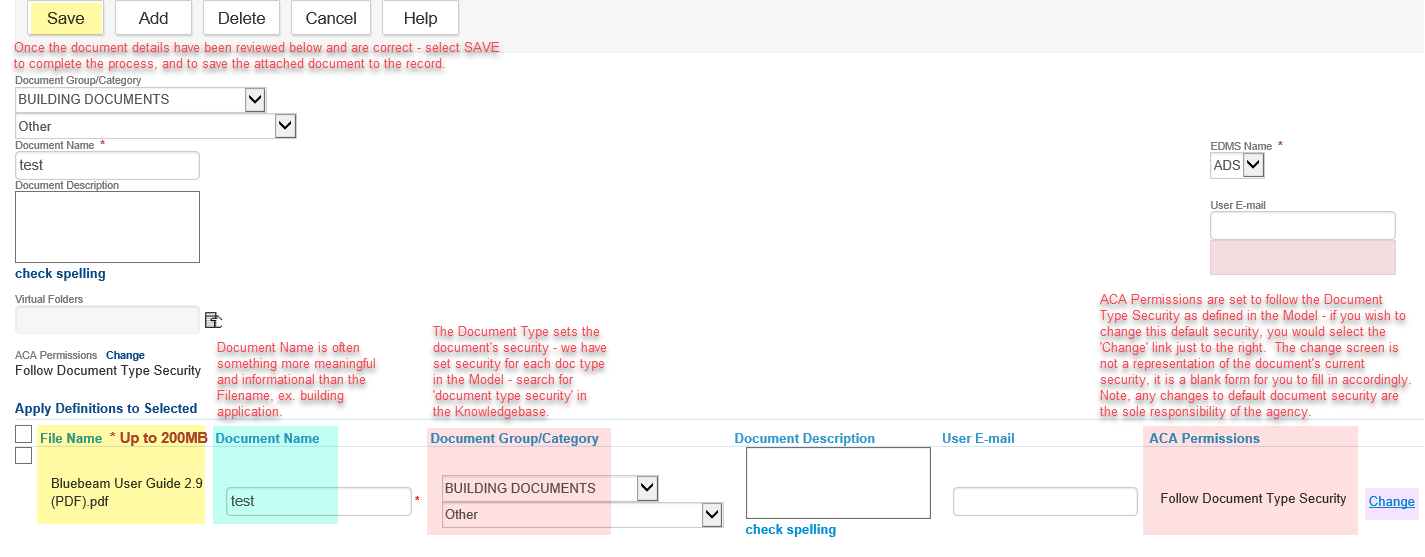 - Once the next screen loads, review the document details along the bottom of the window. IMPORTANT NOTE: ACA Permissions are set to follow the Document Type Security as defined in the Model - if you wish to change this default security, you would select the 'Change' link just to the right; the change screen is not a representation of the document's current security, it is a blank form for you to fill in accordingly. NOTE, any changes to default document security are the sole responsibility of the agency.