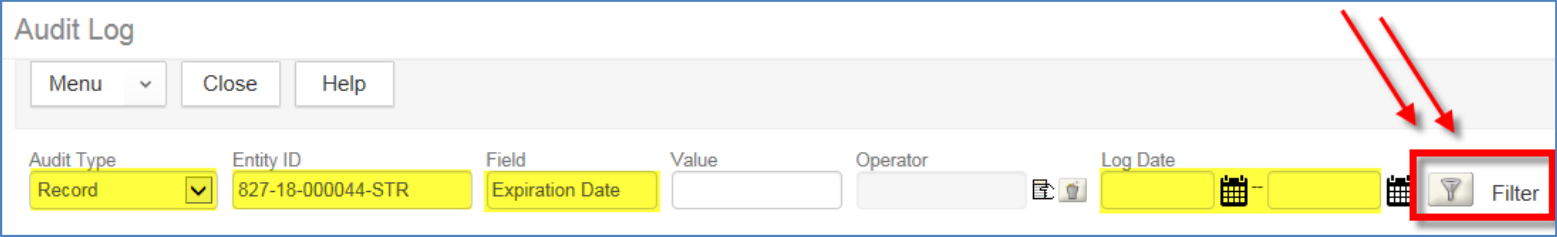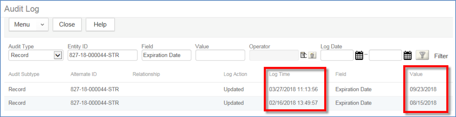 Notice that the Log Time column shows when the Expiration Date was updated, and the Value column shows what the Expiration Date was at that time. In the example below, the record has been updated twice.