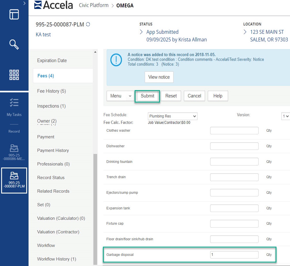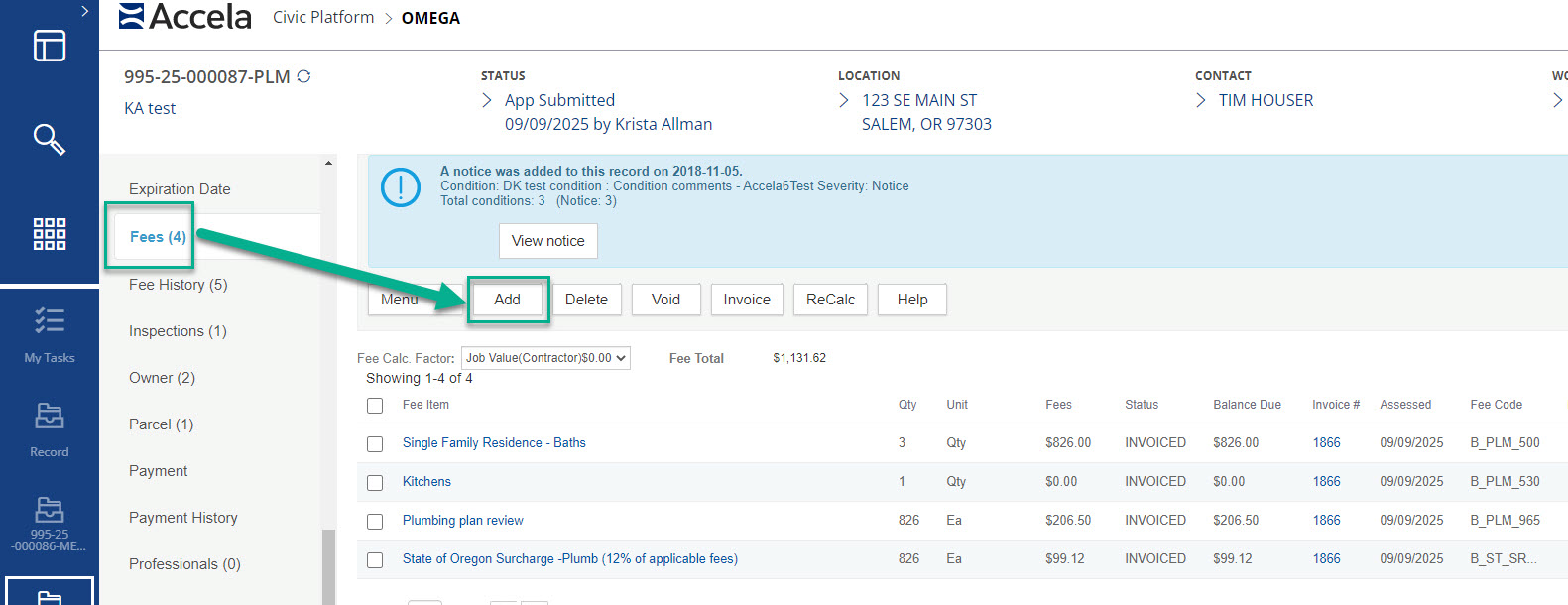 There are times when you will need to add a new fee item to a record that has already been paid. For example, a contractor is doing a remodel and forgot to add a garbage disposal to the permit.
