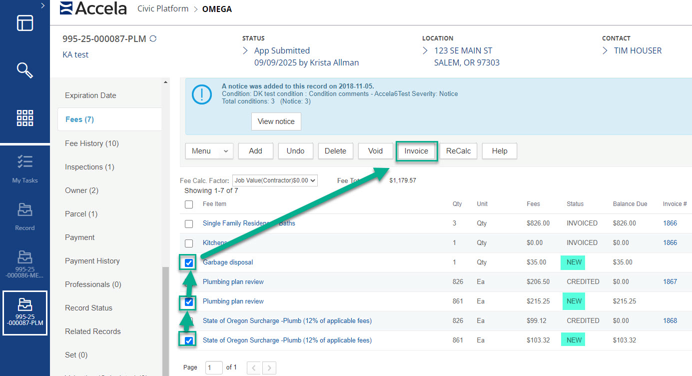 The new fee items and the State Surcharge will have a new status, Invoice the new fee items by clicking the box next to them and click on Invoice at the top of the page, then go the Payment page.