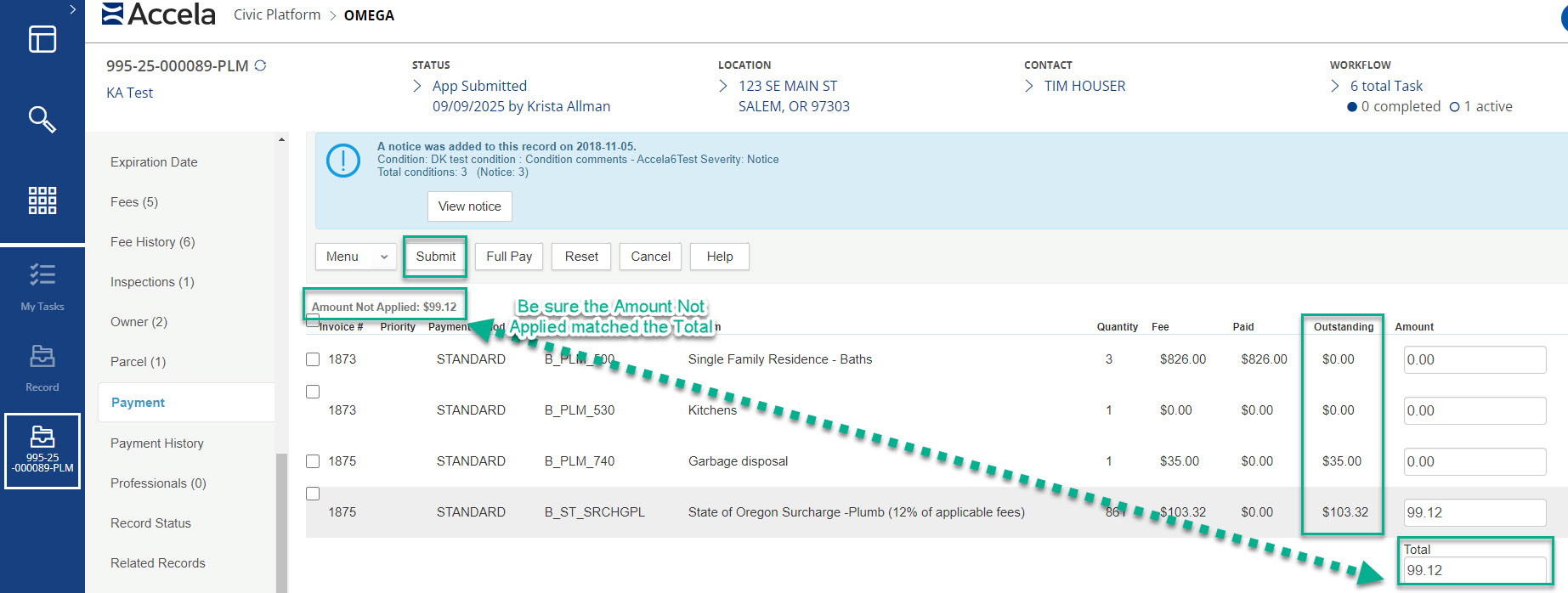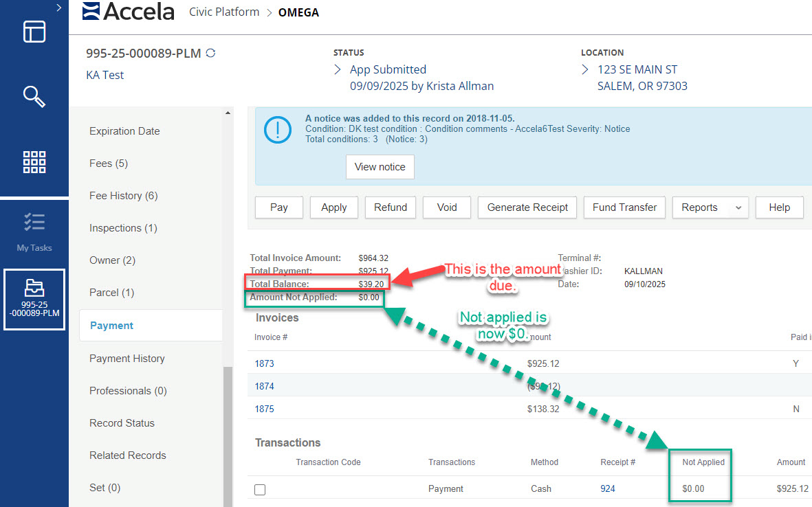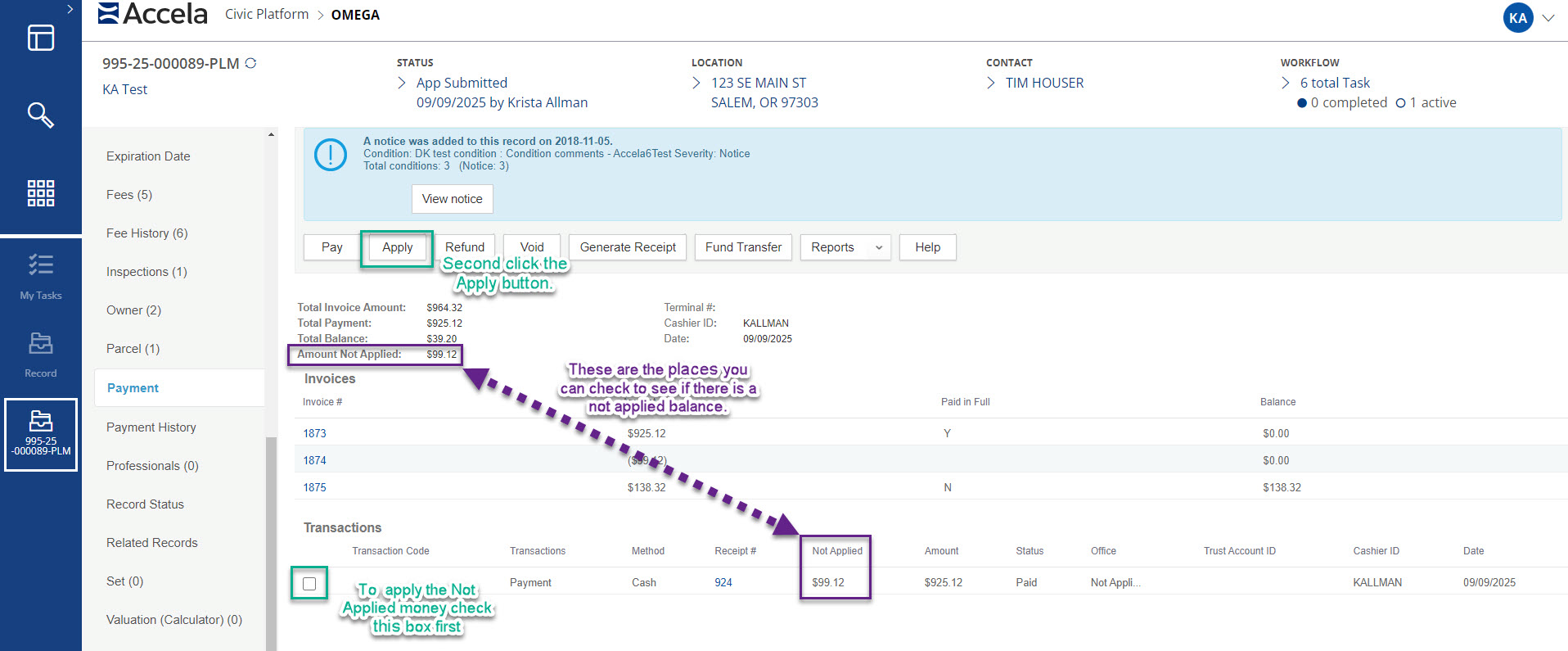 Note: It is very important to Apply the Unapplied amount before processing payment. If you process a payment before Applying the fees, Accela will Apply them at random and this will affect your account codes and receipts.