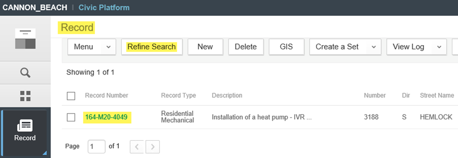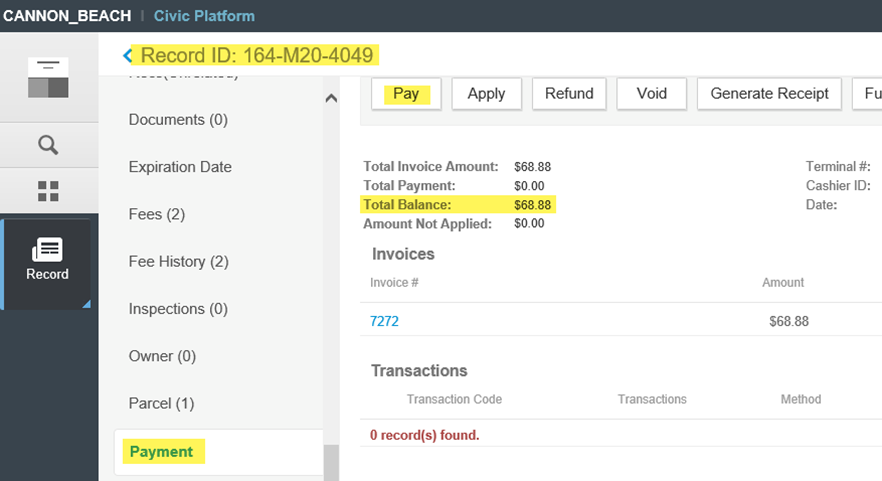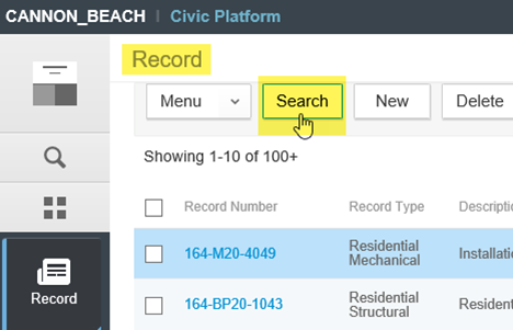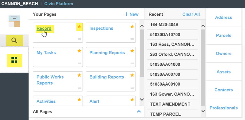 Locate the permit/record you are needing to receipt payment for. You would do this thru the Global Search (magnifying glass icon ) or thru the Record list page in your Launchpad group ( ). If you are not seeing the Record list page in your favorites (with the star filled in yellow, then you will need to first favorite this page from the All Pages dropdown before it is available in your Launchpad pages. Do not forget when searching for converted records, to enter your agency’s specific source sequence number prior to the record number, i.e.. 164-M20-4049.