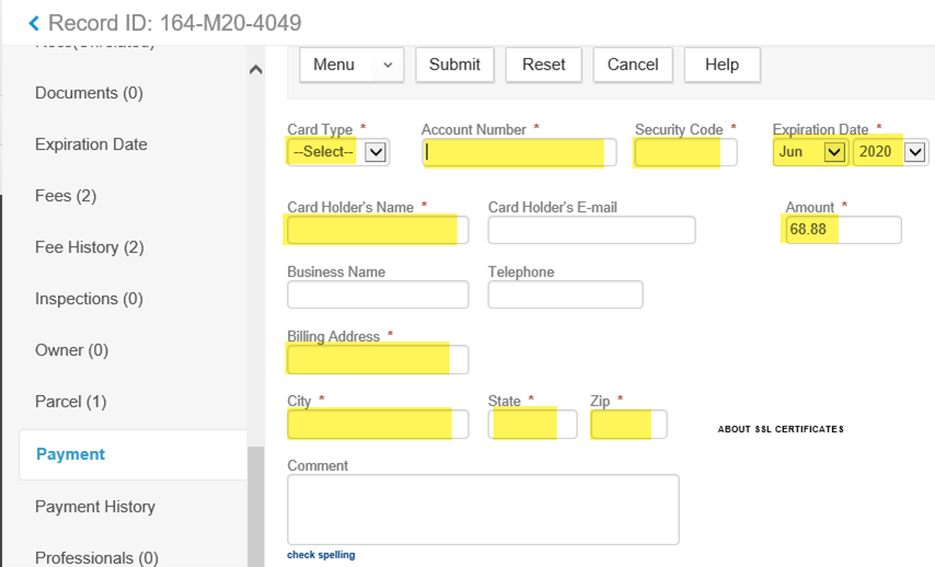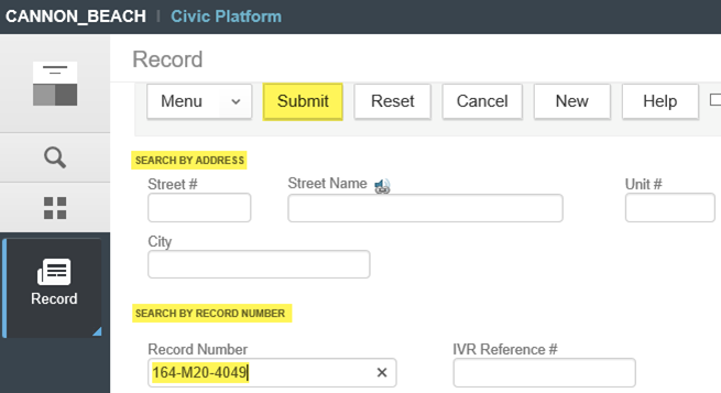 Once the Search page loads, you can search by address or by record number depending on what information the customer provides to you. There are many other search criteria available as well. Select Submit to search.