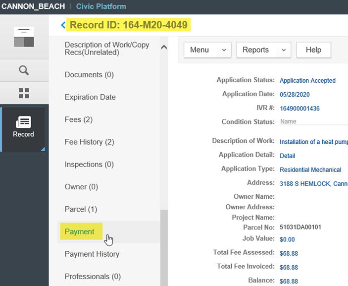 Once you are in the individual record, scroll down to the Payment tab in the light grey Navigation pane.