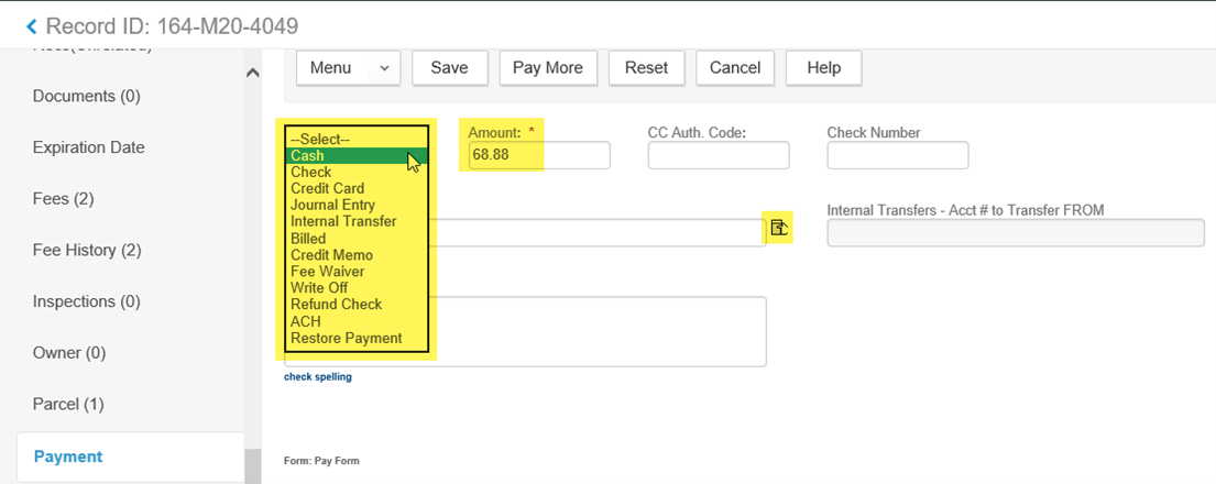 The Pay form will load. Select the appropriate payment method from the dropdown, select the Payor (from the picker - do not free-type in payor as this is not auditable – remember that if the payor is not yet associated to the record, go to the Contacts tab in the Navigation pane and add the contact first, then return to the Payment tab to process the payment). The payment Amount will autofill with the full outstanding balance, make sure to edit this if the customer is not paying in full. Partial payments will require you to disperse the payment to the individual fee items – remember to pay State Surcharge commensurate to any Permit fees you are paying to avoid any State Surcharge imbalance. A Check payment method will require the Check Number field. See next step for Credit Card payment method details.
