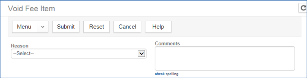 2. Check the box next to the fee(s) you need to void for refund – select the Void button. A Void Fee Item pop-up window will open where you will need to select a Reason for the refund using the dropdown menu, and then enter any pertinent comments – select the Submit button.