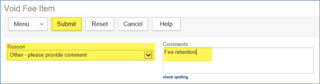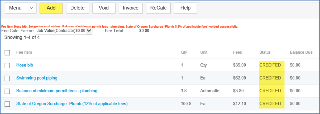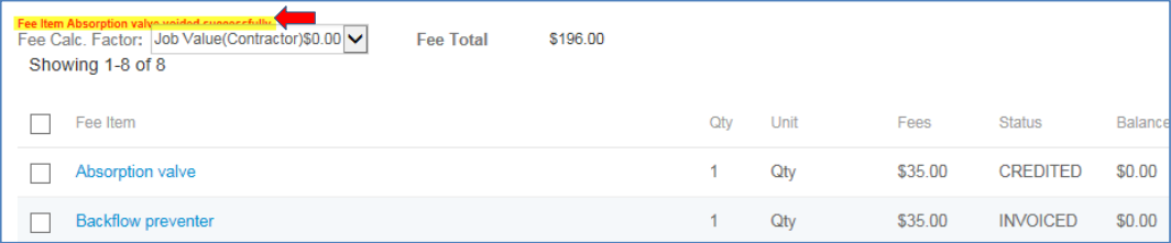 The Fee page will then be refreshed to reflect the changes you have made. There will be a red confirmation statement of your void, if successful.