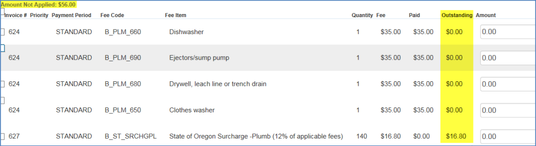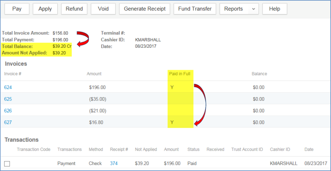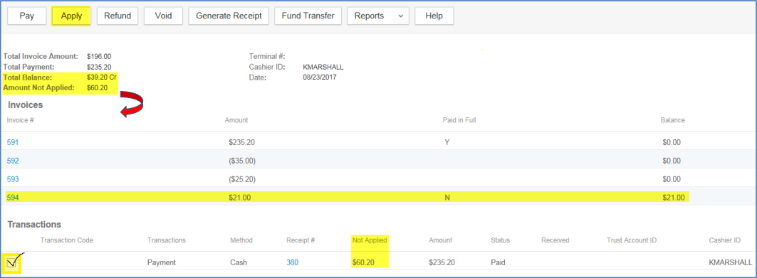 Prior to reapplying the payment, in this example notice the difference between the Total Balance ($39.20) and the Amount Not Applied ($60.20) – this difference is the Amount Not Applied ($60.20) minus the amount of the new State Surcharge fee ($21) = $39.20.