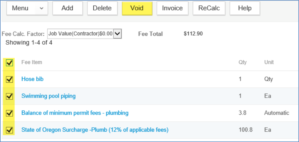 To process the Permit Fee Retention, go to the Fees tab in the record navigation. Select the applicable permit fees that have been invoiced and paid, and void them to credit if they have not been credited already.