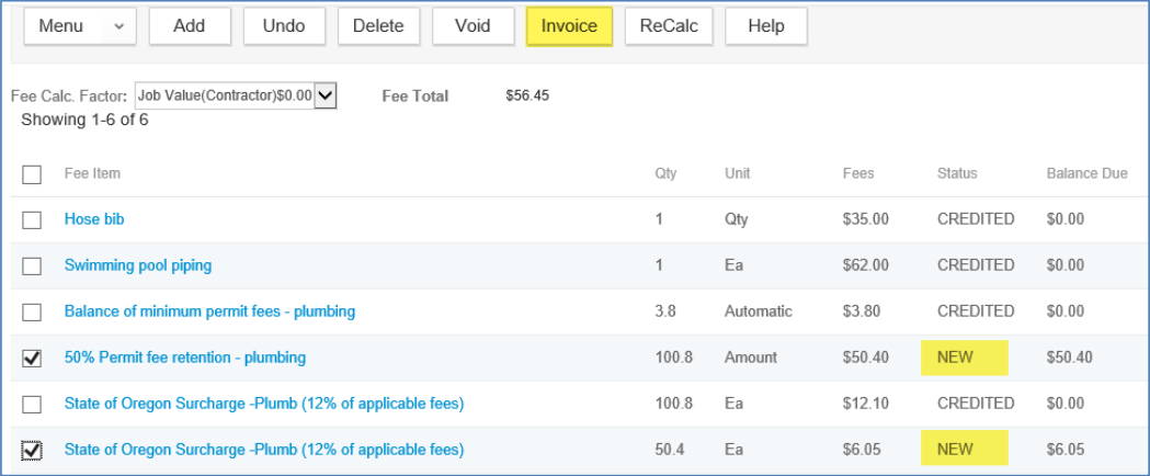 5. Click Submit – the Permit Retention fee will calculate the percentage at the rate you selected and will automatically recalculate State Surcharge at 12% of what is being retained. Invoice the new Permit Fee Retention and State Surcharge fee items.