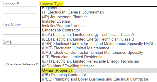 The ePermitting system has been designed to accommodate when the Owner is acting as their own contractor and doing their own work. When creating a new application or editing an existing record, go to Professionals > do a Look Up or Search for License Type = Owner (Property):