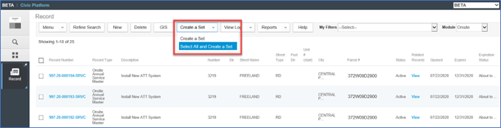 2. From the new list of records, hover over Create a Set > click Select All and Create a Set.