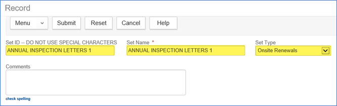 Set Type = Onsite Renewals (this must be Onsite Renewals so that you can execute the appropriate letter script)