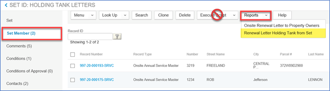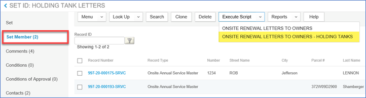 5. Click on Set Member > hover over Execute Script > click ONSITE RENEWAL LETTERS TO OWNERS – HOLDING TANKS.
