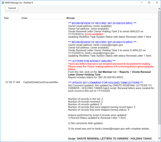 6. The script could take a few seconds to a few minutes to finish executing.  You will know when the script has finished because the screen will refresh and a popup window with an output of the script will display.  The output displays the actions for each record in the Set.