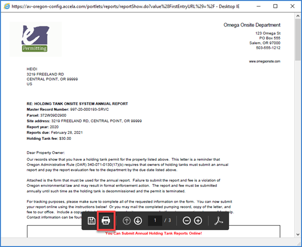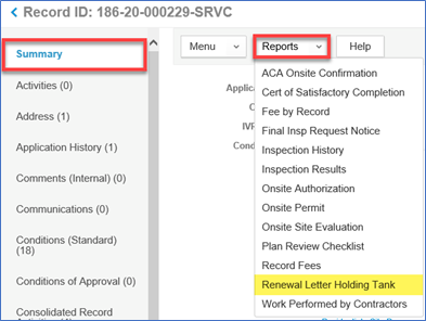 11. If you need to print out another copy of the letter, you can generate it from the Summary tab > hover over Reports > click Renewal Letter Holding Tank.  Please note that if the letter was already emailed to the property owner, you will have to get a copy of the report from the Communications.