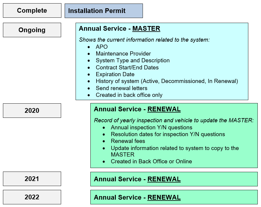 This diagram describes the purpose of each record and the hierarchy relationship between the Permit, Master record, and Renewal record.  In most cases, this will be the hierarchy but there may be exceptions where the Permit is not related, for example when the Permit was not converted or created in Accela.